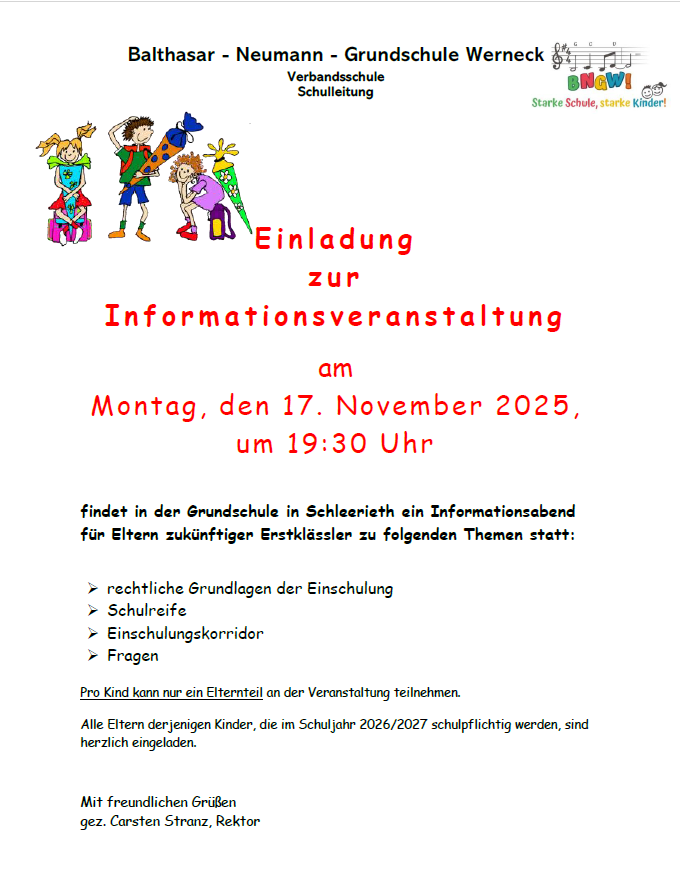 Infoabend für Eltern zukünftiger Erstklässler Posted on 16.10.2025 by bngw Bitte beachten Sie den Veranstaltungstermin, den 17.11.2025!!!! Im Amtsblatt vom 17.10.25 wurde der 11.11.25 veröffentlicht. Auf Wunsch der Eltern wurde der Termin jedoch verschoben!!!!
